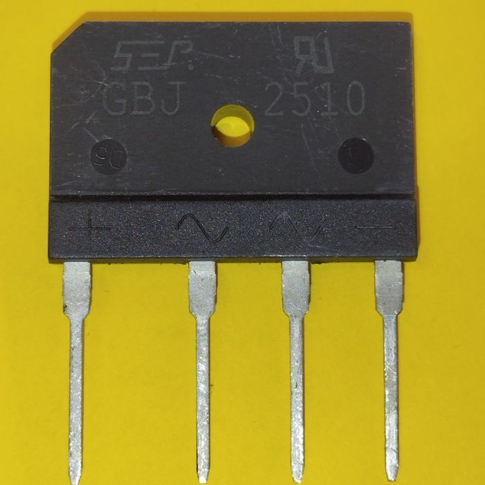 Діодний міст GBJ2510 - однофазний двопівперіодний перетворювач змінного струму в постійний пульсуючий. Використовується в електричних ланцюгах з навантаженням до 25А і зворотною напругою 1000В. Відрізняється досить високою перевантажувальною здатністю і низьким прямим падінням напруги.