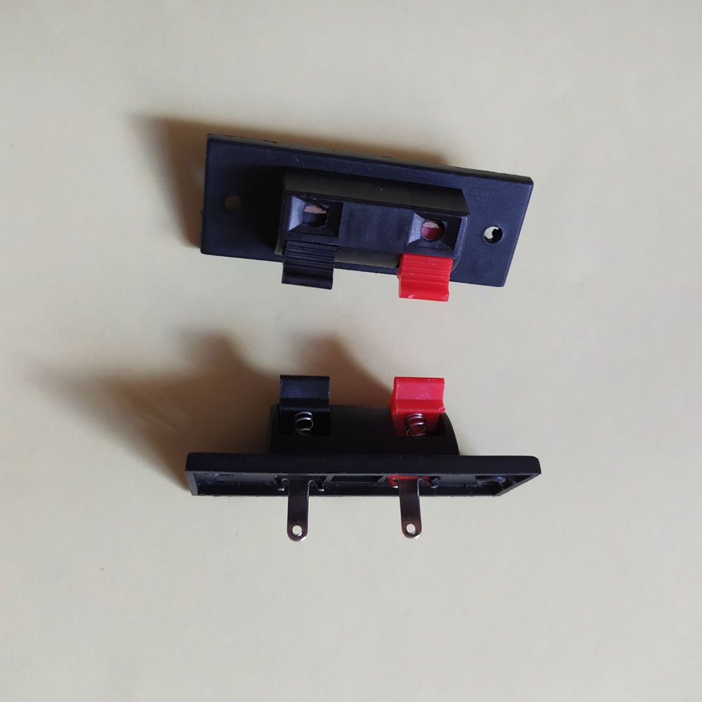 Гніздо акустичне (затискач) 2-х контактне для підключення проводів акустики за допомогою фіксації клемними колодками. Колонкове гніздо розташоване на прямокутній панелі, що має розміри 51,8 х21, 6 мм.