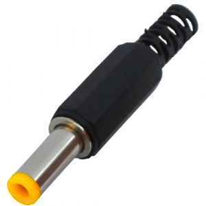 Корпус штекера питания пластиковый, длиной 14 мм, чёрного цвета, с жёлтым ободом.