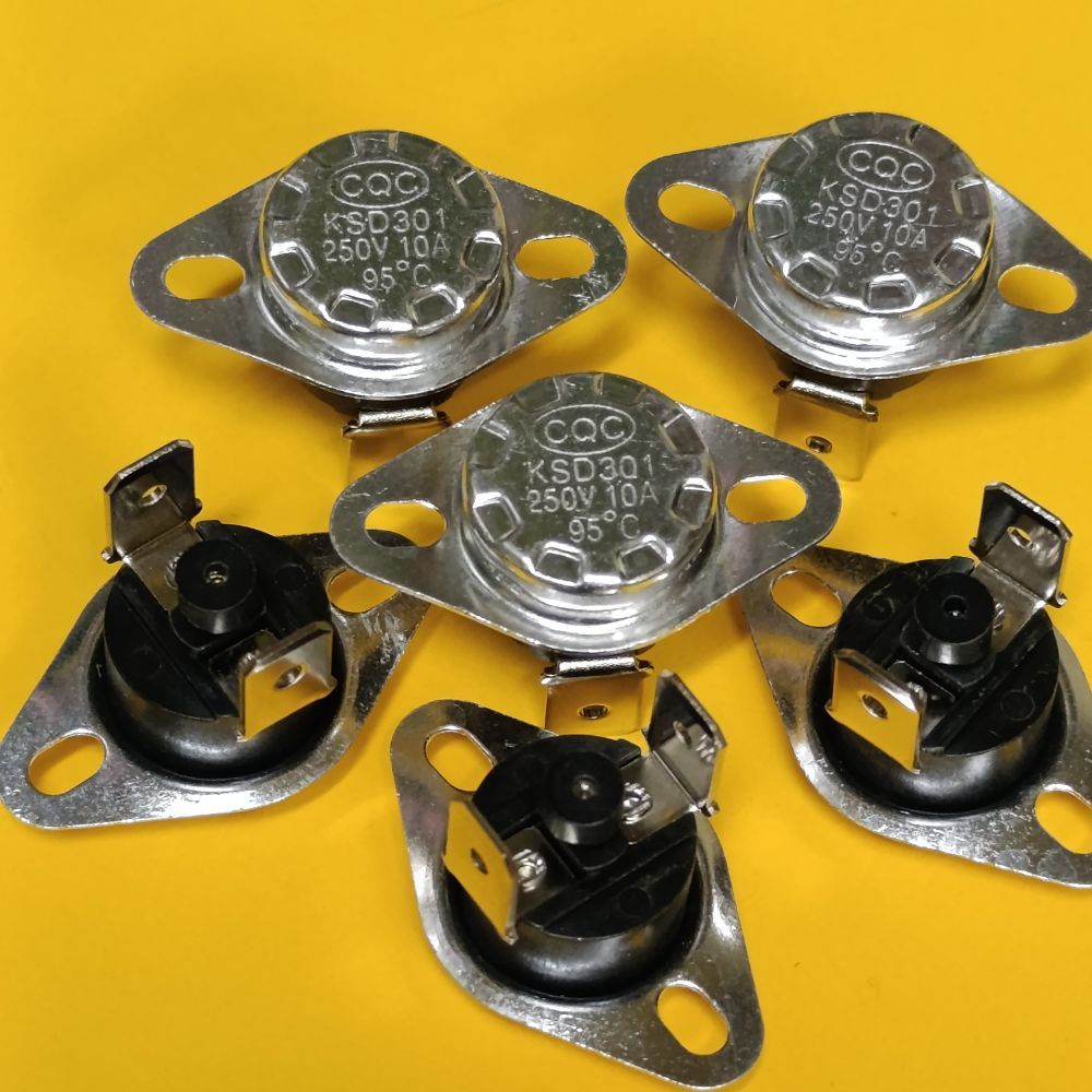 Термостат серії KSD301 95°С 10A нерегульований нормально замкнутий термостат, з нерухомим фланцем і вертикальними контактами FBVL, біметалічний, з кнопкою ручного скидання.